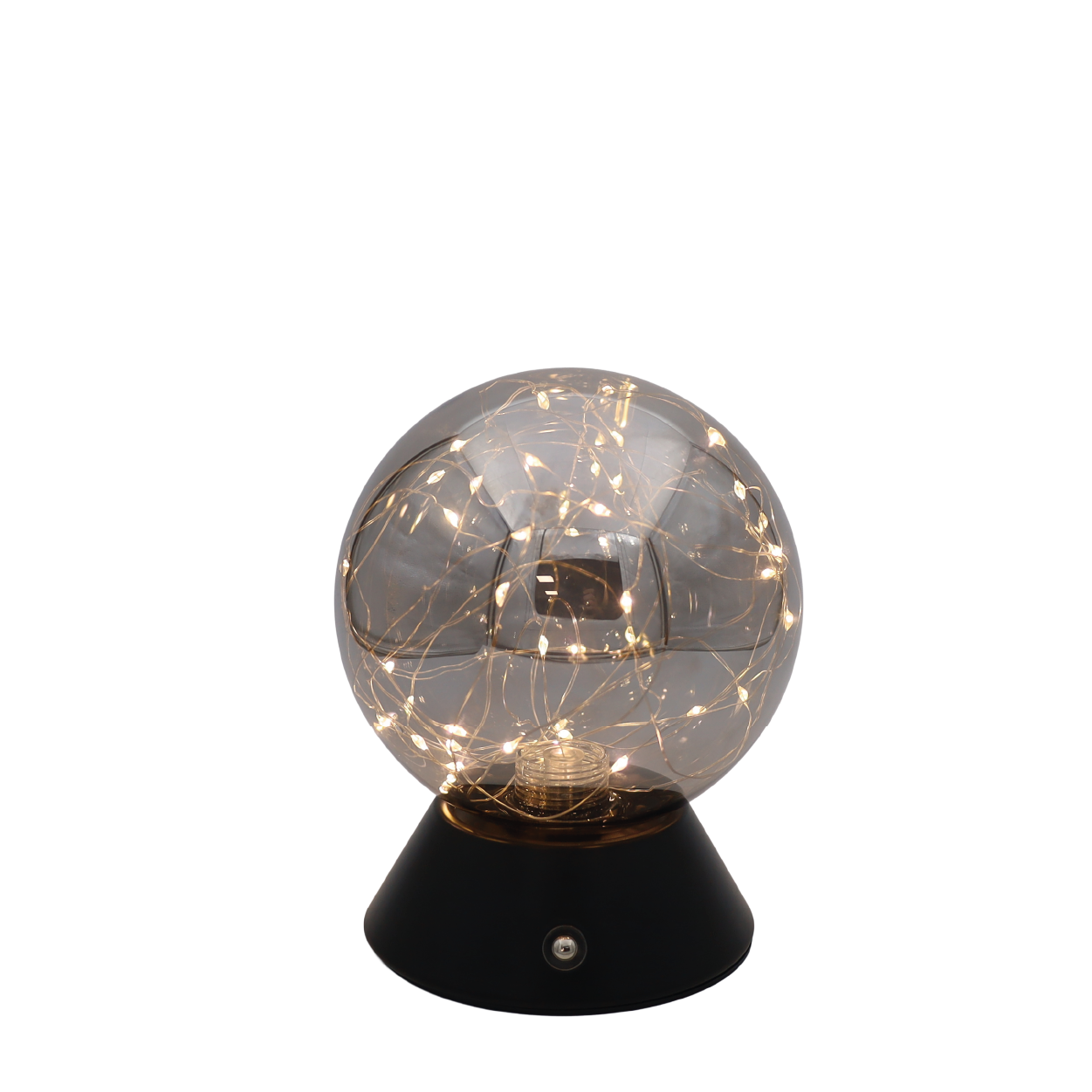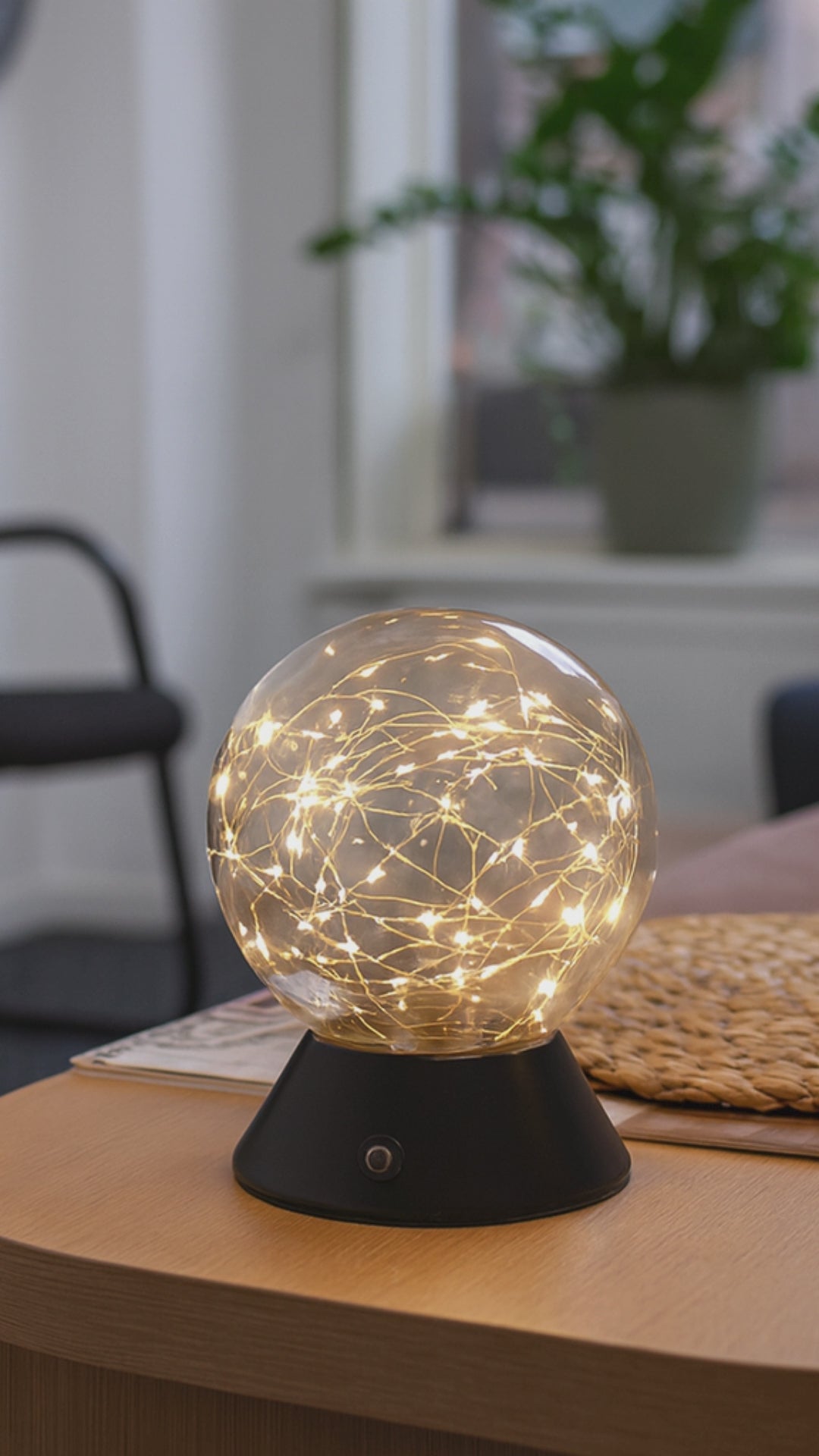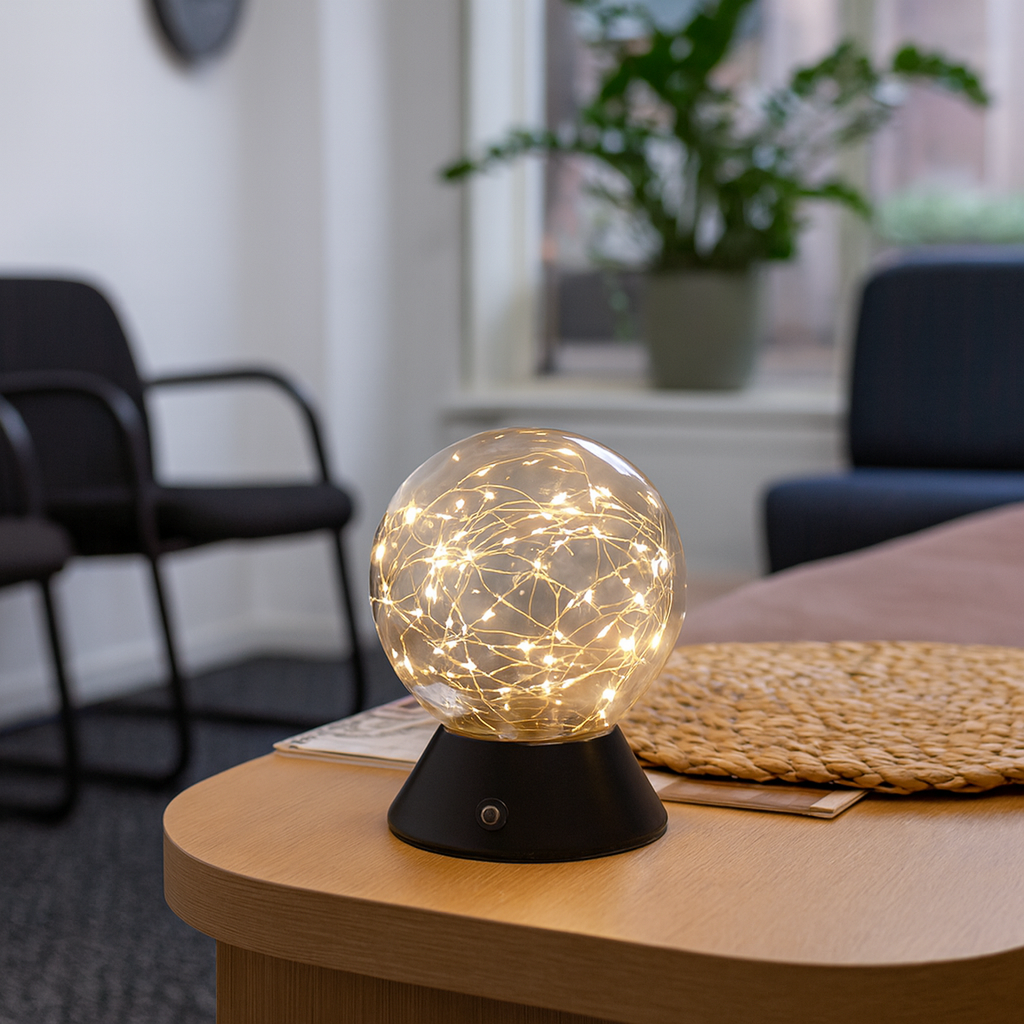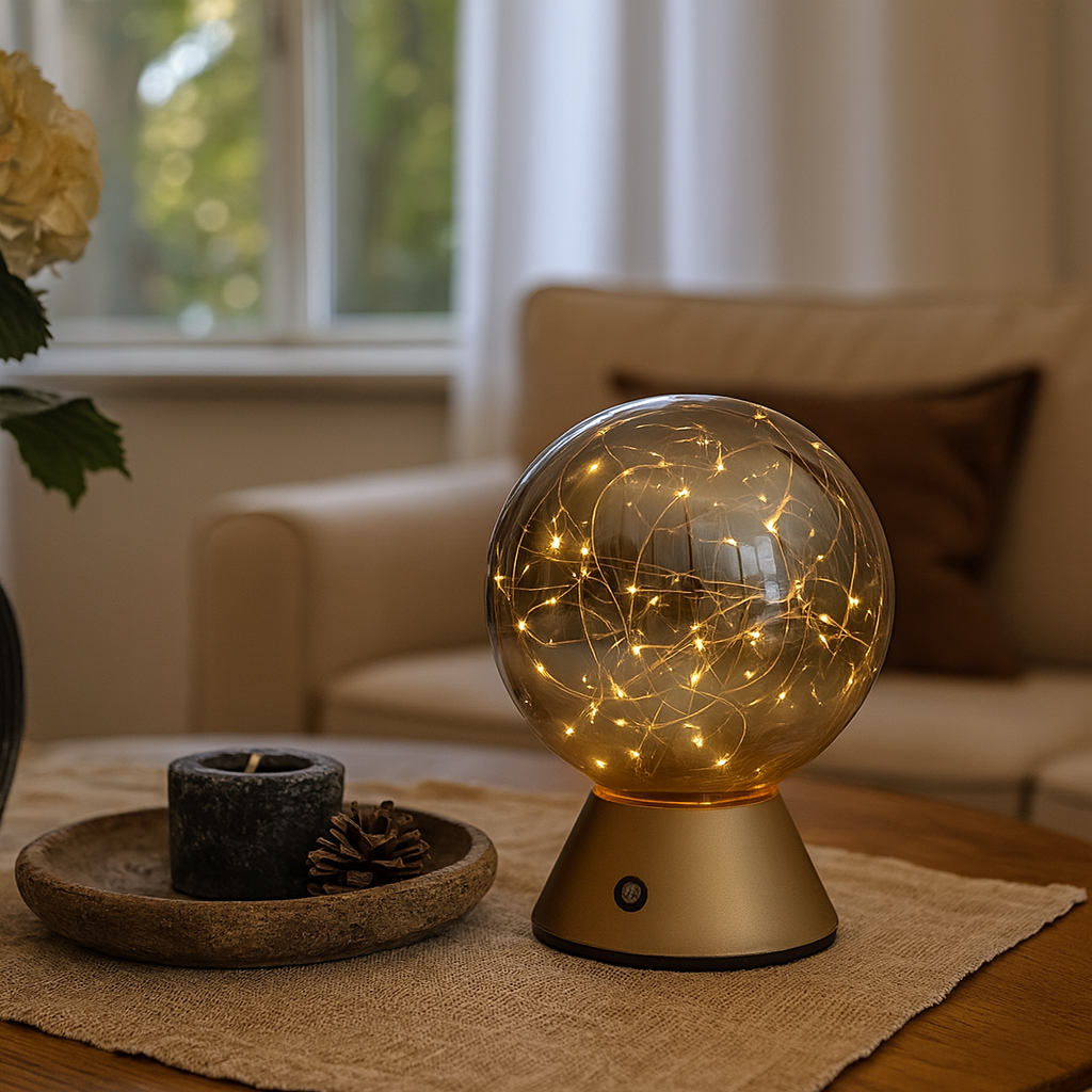 Die Tischleuchte Mila vereint Ruhe, Wärme und Stil. Sie eignet sich perfekt für Wohnzimmer, Schlafzimmer, Flur oder Büro. Dank ihres eleganten Designs mit einer Glaskugel, die mit Mikro-LEDs gefüllt ist, erzeugt Mila in jedem Raum sofort ein stimmungsvolles, sternenähnliches Licht.