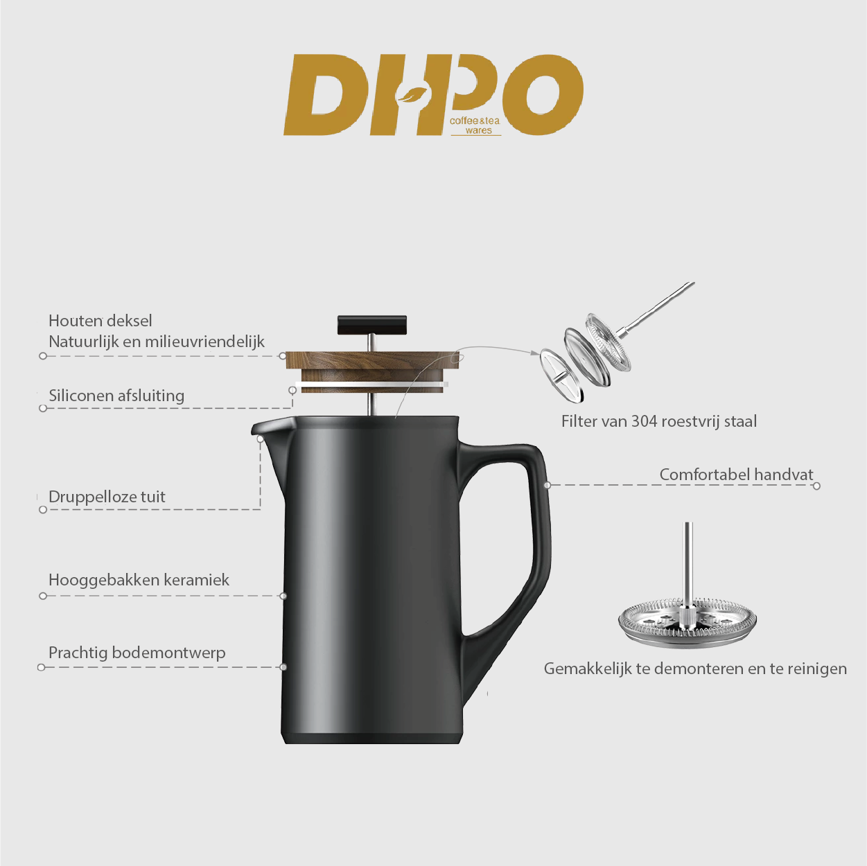 De DHPO French Press Eternity 600ML heeft een gladde en glanzende afwerking, waardoor het een prachtige toevoeging is aan elke keuken of koffiehoek. De duurzame samenstelling zorgt voor langdurige prestaties, terwijl de keramische behuizing helpt om de optimale zet-temperatuur te behouden tijdens het hele proces. Het comfortabele handvat is ergonomisch vormgegeven.